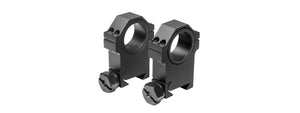 SPECIFICATIONS: Material: Black Anodized Aluminum Quantity: Set of 2 Optic Centerline Height: 0.9 Inch Ring Overall Height: 1.7 Inches Weight: 1.5 oz Includes: Mounting tool FEATURES: 1" Scope Tube Diameter...